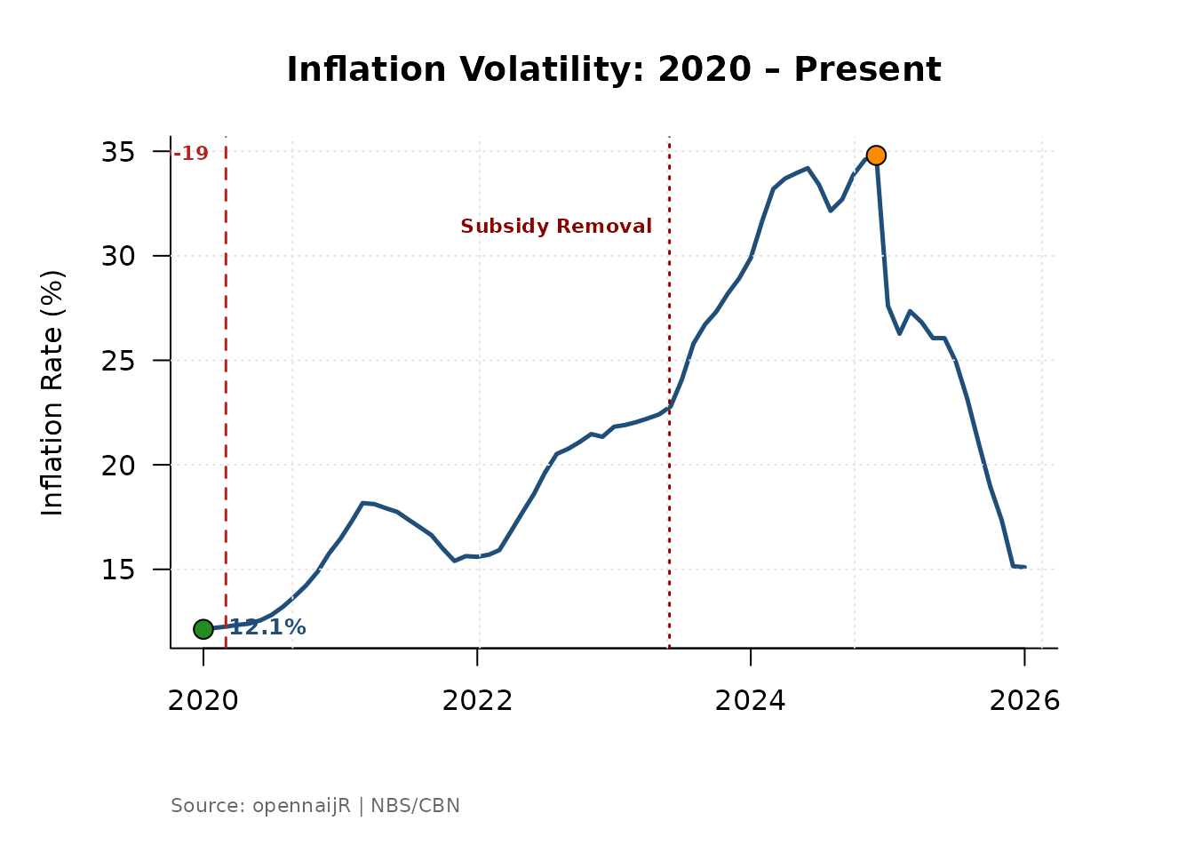 These represent structural breaks in the Nigerian economy that consistently appear in macroeconomic research. When your inflation series shows a sharp inflection, the markers tell you whether a known shock coincides with it.